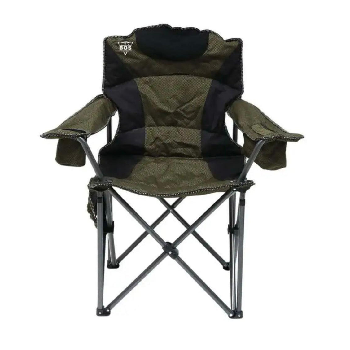 The Bos Luxury Camping Chair elevates outdoor relaxation with thoughtful engineering and refined comfort. Its robust 22 mm steel frame supports up to 150 kg, while premium polyester fabric and a full-height backrest provide substantial support during extended use. Padded armrests and seat cushioning reduce fatigue, while integrated features (a mesh cup holder, insulated armrest cooler pocket, and side utility pouch) keep essentials within reach. Weather-resistant construction ensures durability across seasons, and the compact fold design with included carry bag makes transport effortless. Available in a sophisticated green finish.